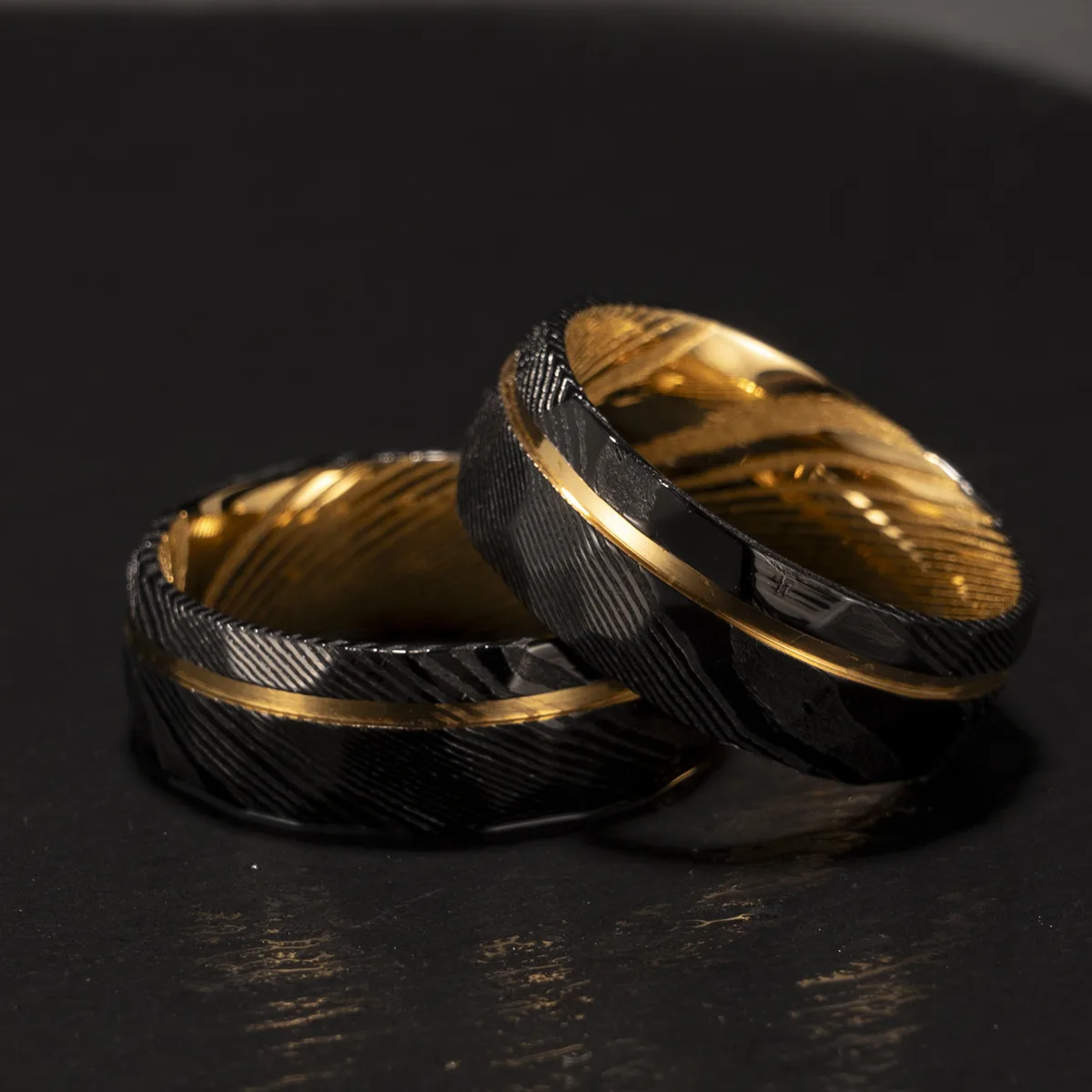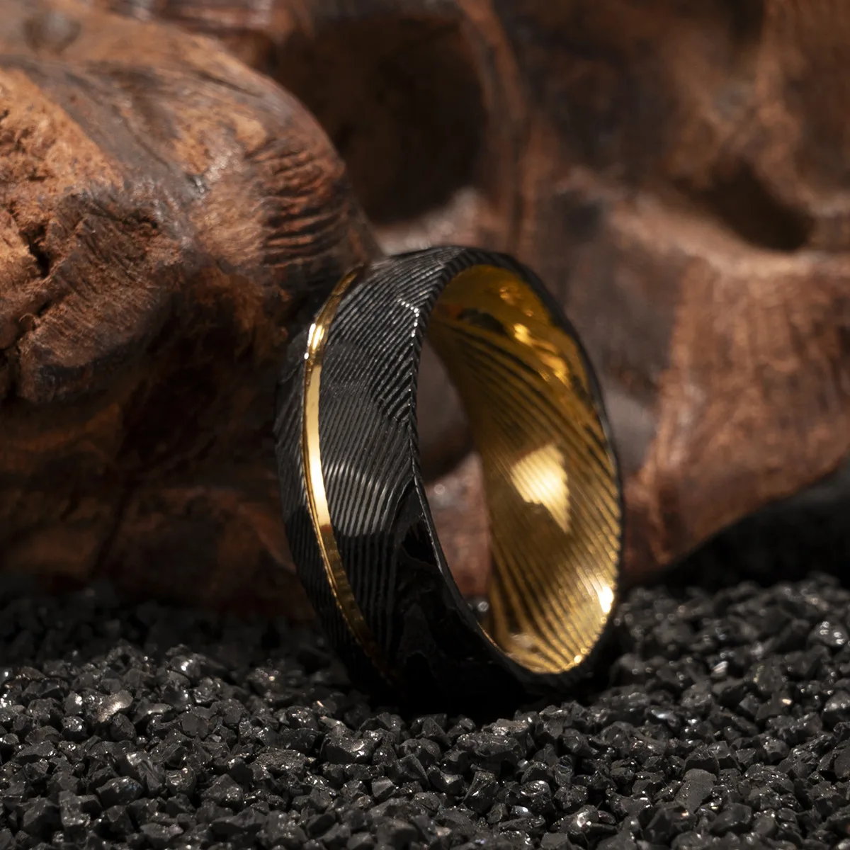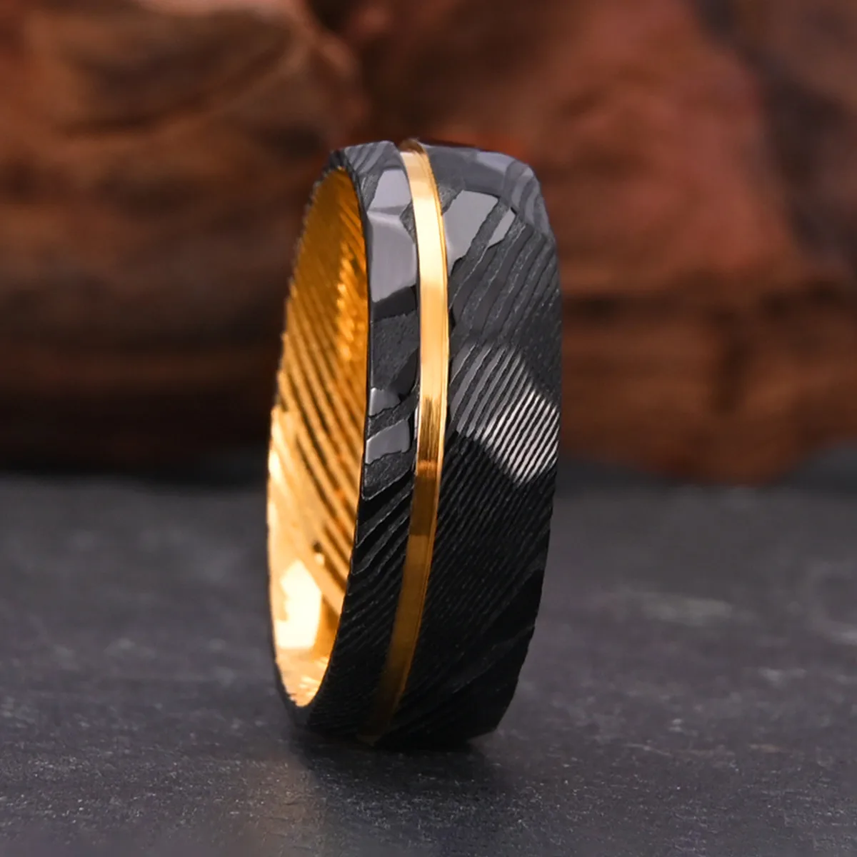 The interior’s polished gold finish offers both luxury and comfort, while the Damascus steel structure ensures superior hardness and scratch resistance. Available for bulk wholesale and personalized logo engraving, this ring is ideal for men seeking distinctive wedding or daily wear jewelry.