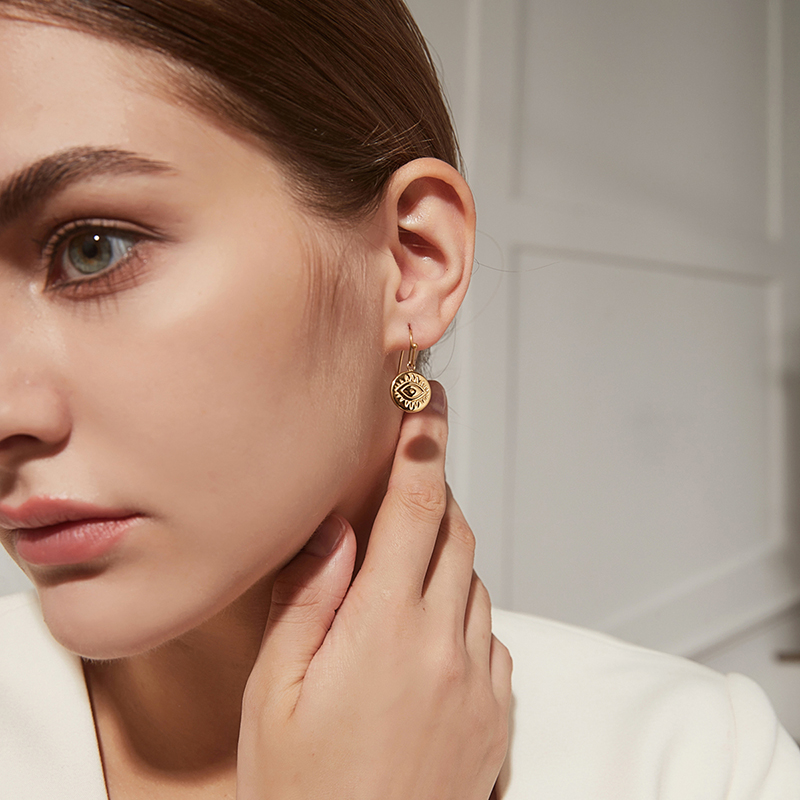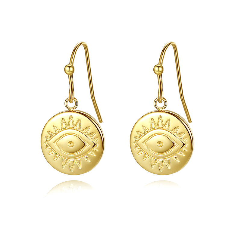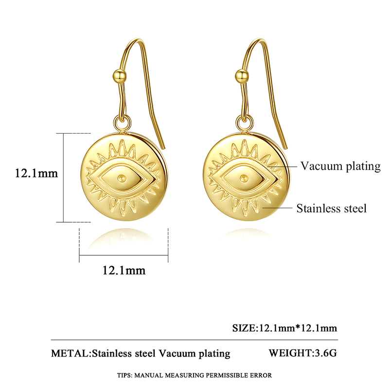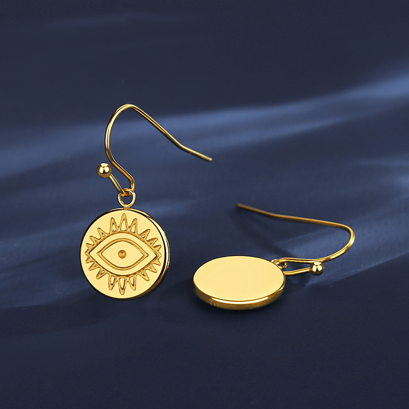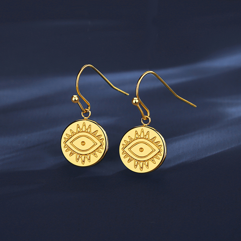 Stylish gold plated Eve eye fishhook earrings in durable stainless steel. Hypoallergenic & lightweight for boho chic fashion statements.