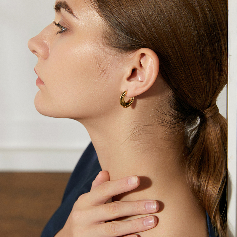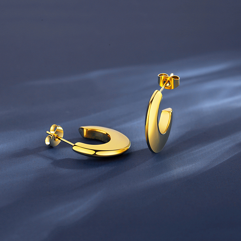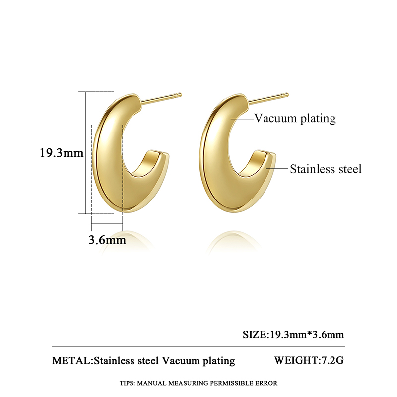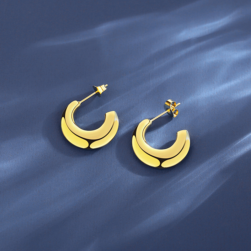 Trendy 18K gold plated C-shaped hoop earrings in hypoallergenic stainless steel. Chunky minimalist design for everyday elegance.Minimalist Hoop Earrings.