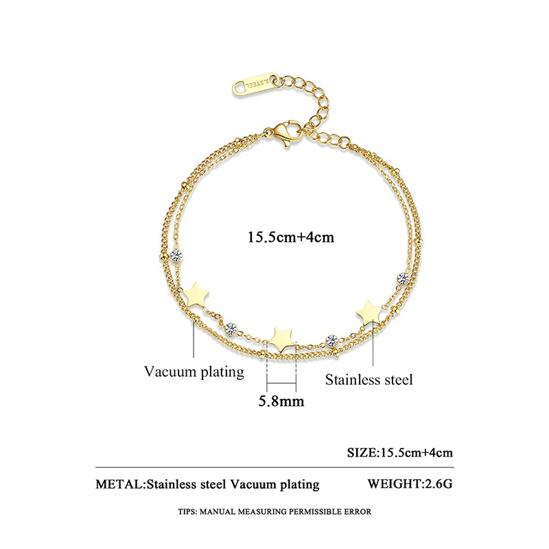 Minimalist stainless steel bracelet with 18K gold plating, featuring delicate star charms and double chain links. Gold Star Charm Bracelet