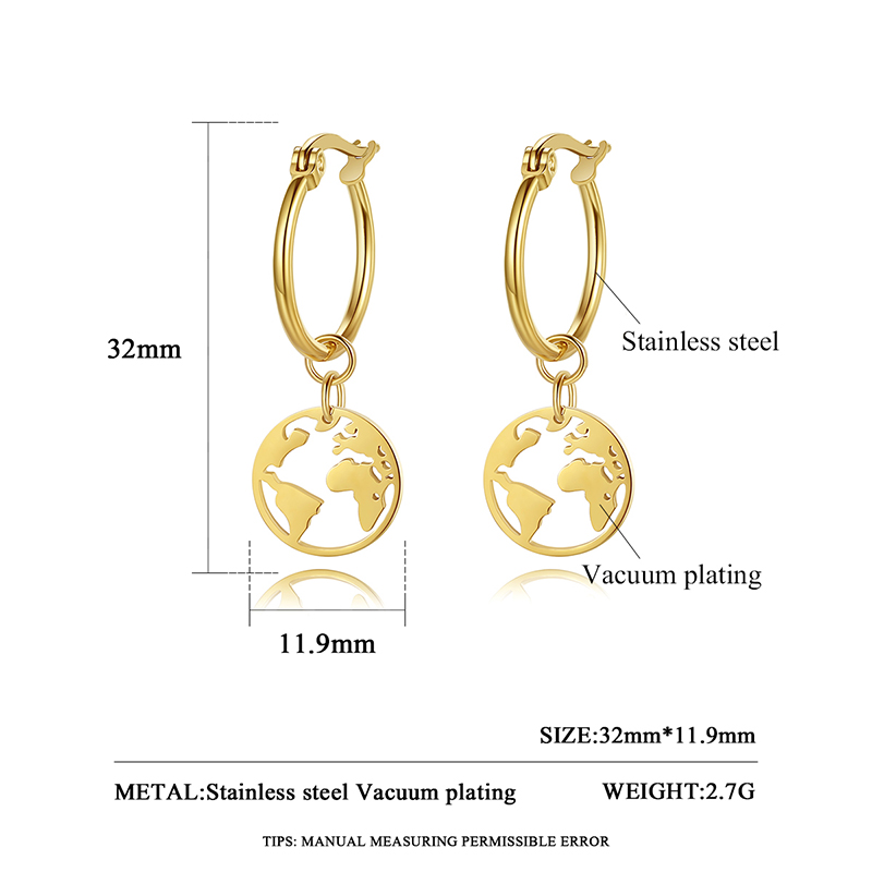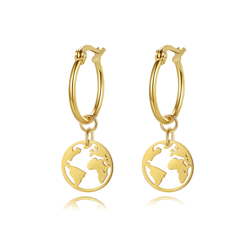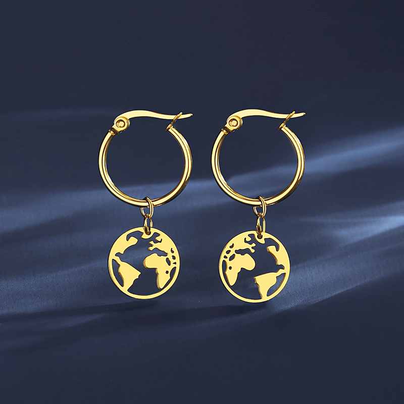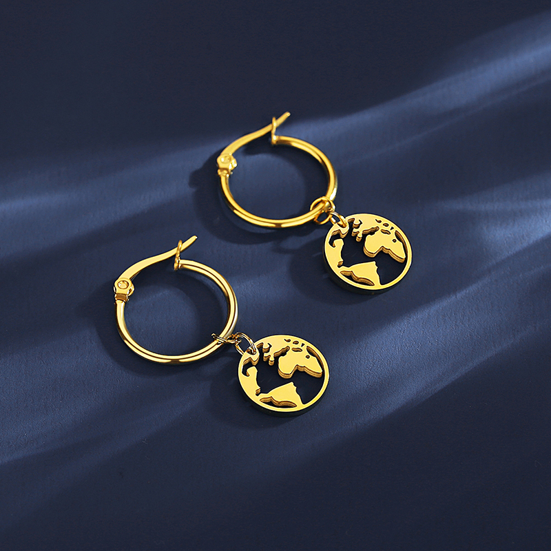 Stylish gold-plated world map hoop earrings with stainless steel charm. Perfect travel-inspired jewelry, hypoallergenic & tarnish-resistant.