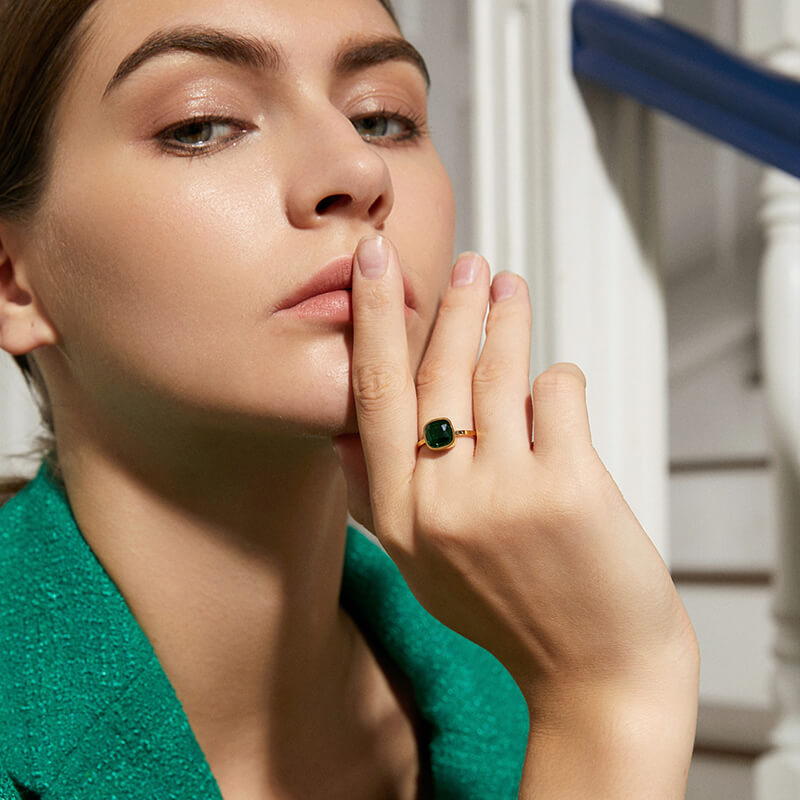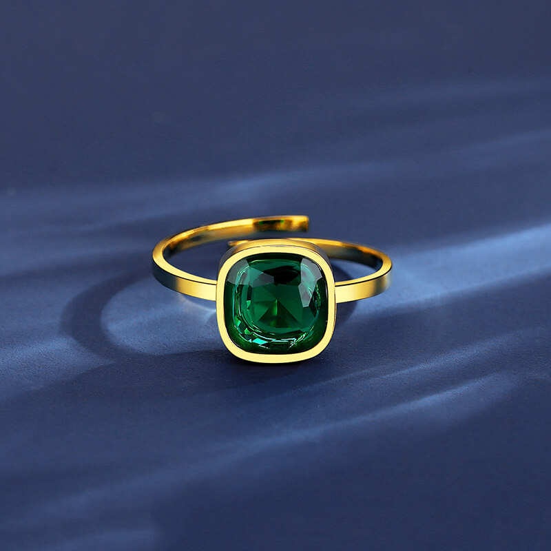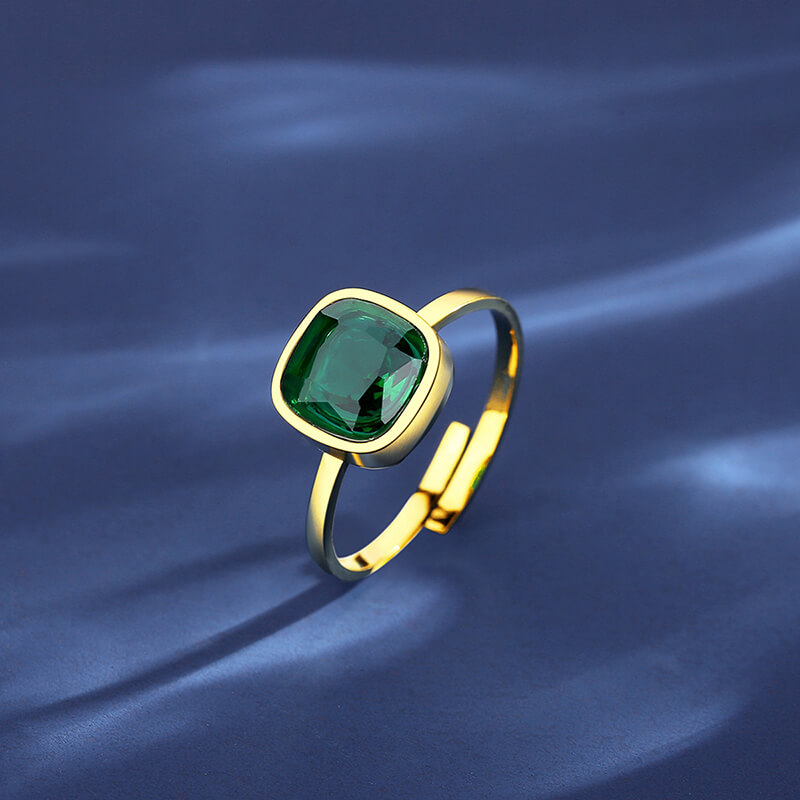 Square emerald rhinestone ring with 18K gold plating & adjustable open band. Timeless vintage jewelry for women’s daily wear or special occasions.