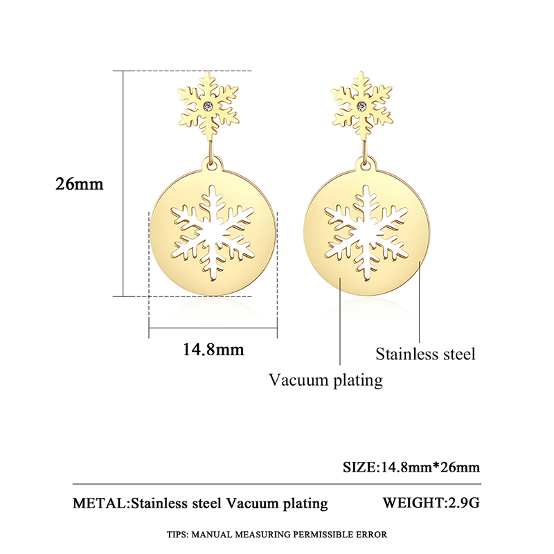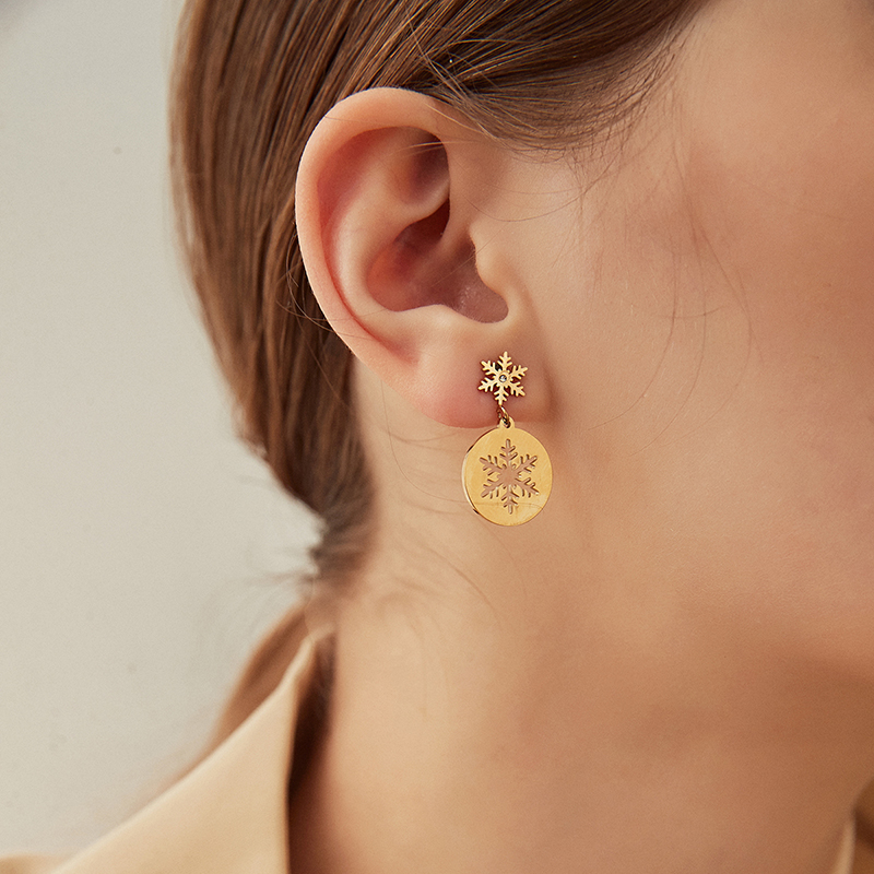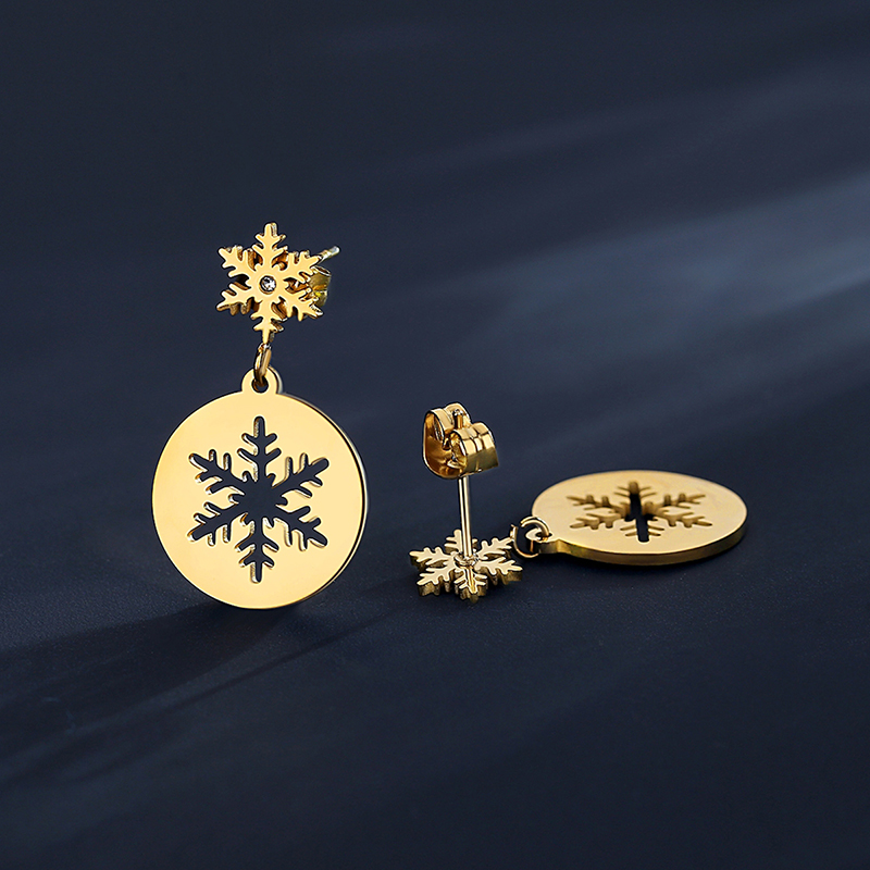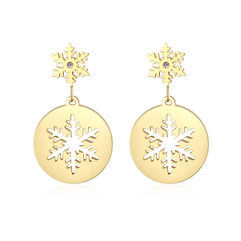 Wholesale gold snowflake drop earrings in stainless steel. Perfect Christmas gifts with hypoallergenic & tarnish-free durability.